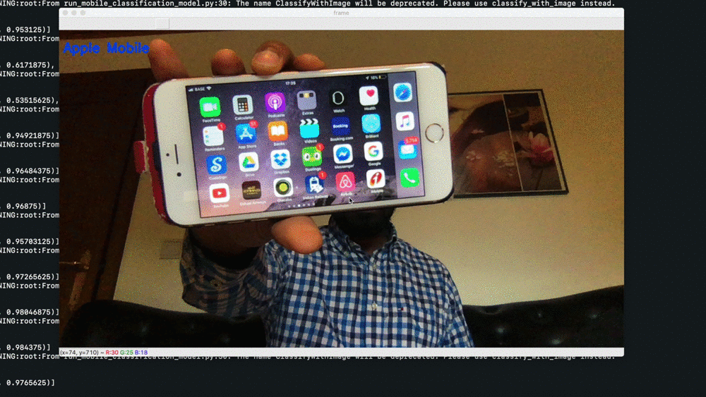 I have trained a simple object recognition Tensorflow Lite model in order to try running the model on USB Accelerator. The model can classify whether a mobile phone is an Apple or an Android mobile when the mobile screen is lit up. Thus it can recognise only the following three features: