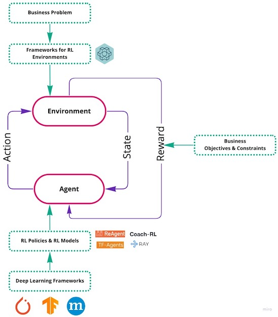 The next big step is to use one of the suitable machine learning frameworks (such as PyTorch, TensorFlow, etc.) to code the RL agent (i.e., the policy & the RL model) and get them integrated with the environment. Once such an integration is done, the agent can be trained by continual interaction with the environment. Once the training is carried out, both the policy and the model are to be integrated with an API app to serve via endpoints. However, it's much easier said than done. Understanding the training and the behavior of RL agents is often cumbersome. Besides, creating a development and a production environment (i.e., docker image for an example) with necessary tools are often time consuming. Additionally, one has to focus on the serving part of the agent such as load balancing, scaling (e.g., running in Kubernetes clusters), etc.
